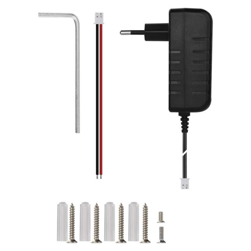 obsah balenia: 1× jednotka dverovej kamery, 1× štít proti dažďu, 1× bezdrôtový zvonček, 1× napájací zdroj, 1× pripojovací kábel, 1× inštalačný materiál, 1× príručka