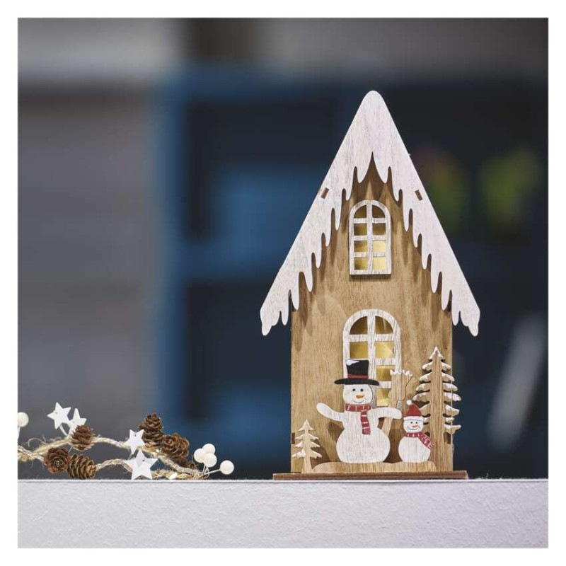 LED dekor. drevená – dom so snehuliakmi, 28,5 cm, 2x AA, vnútorná, teplá biela, časovač