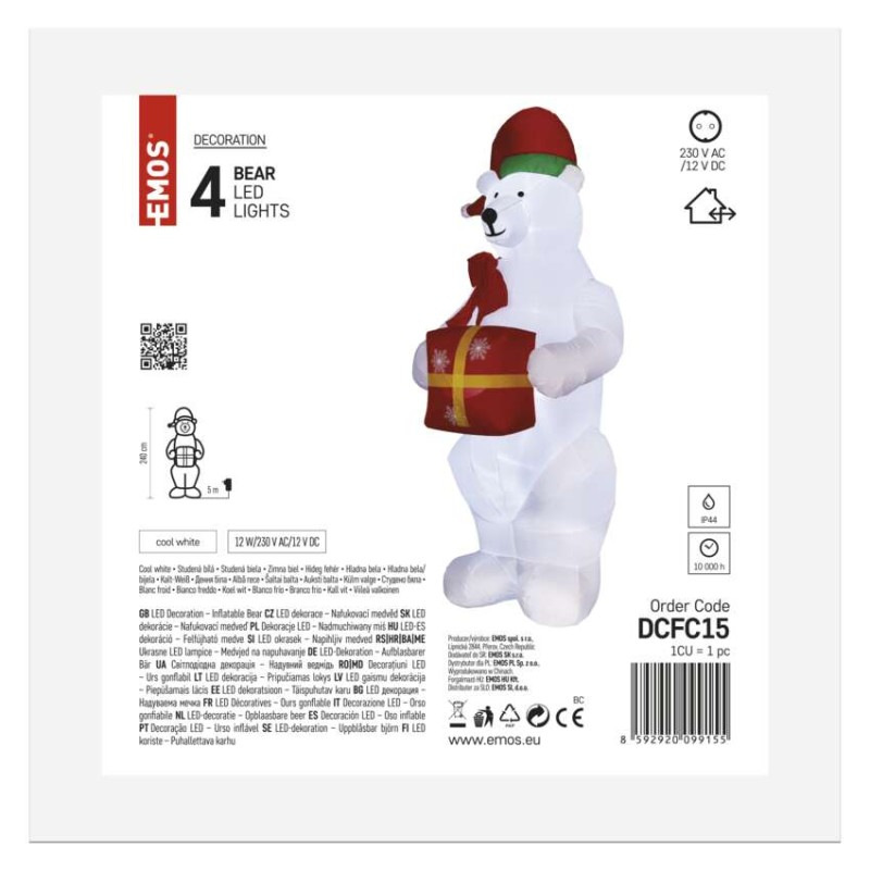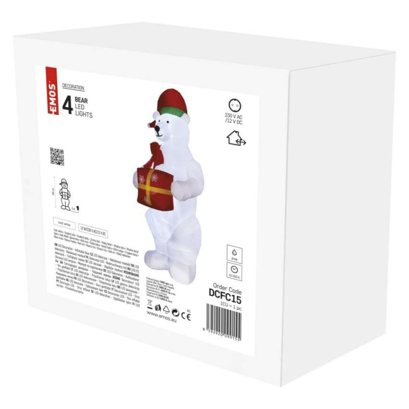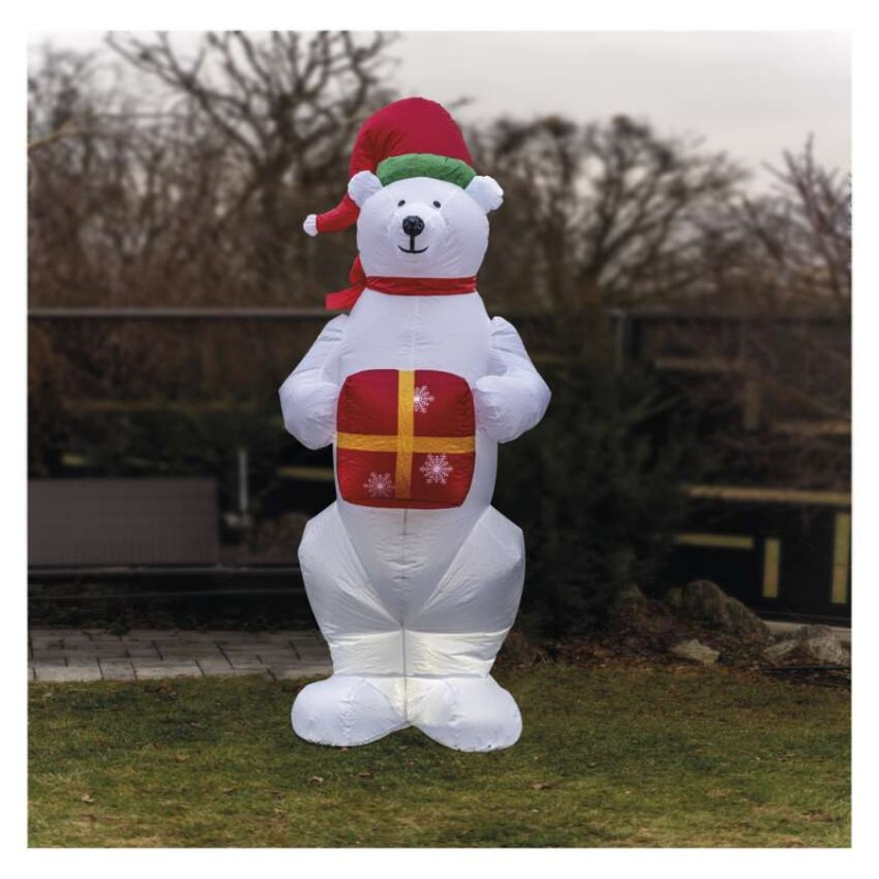 LED ľadový medveď s vianočným darčekom, nafukovací, 240 cm, vonk./vnút., studená biela