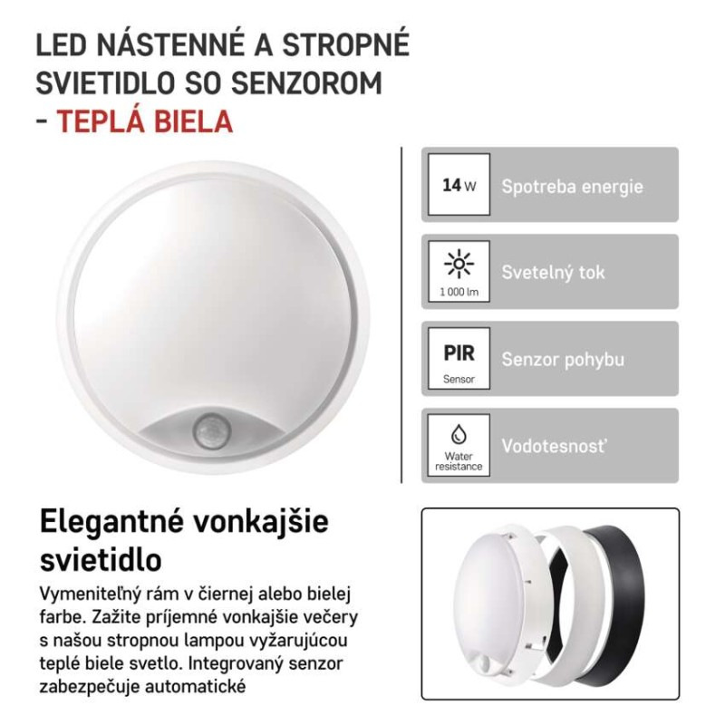 LED prisadené svietidlo ZURI s pohyb. senz., kruhové č/b 14W t.b.