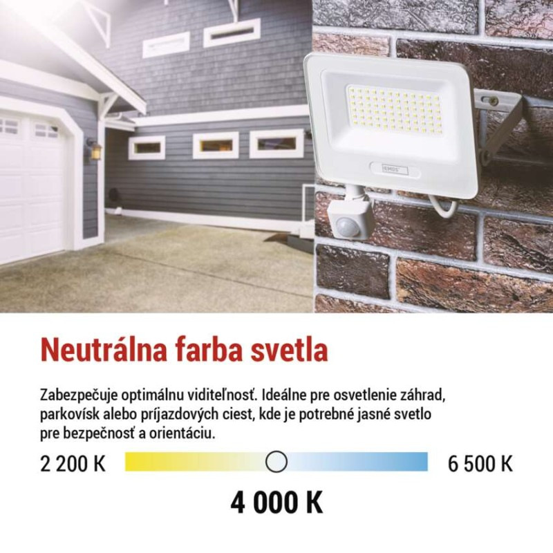 LED reflektor GLARO s pohybovým čidlom, 50 W, biely, IP54, 5000 lm, neutrálna biela