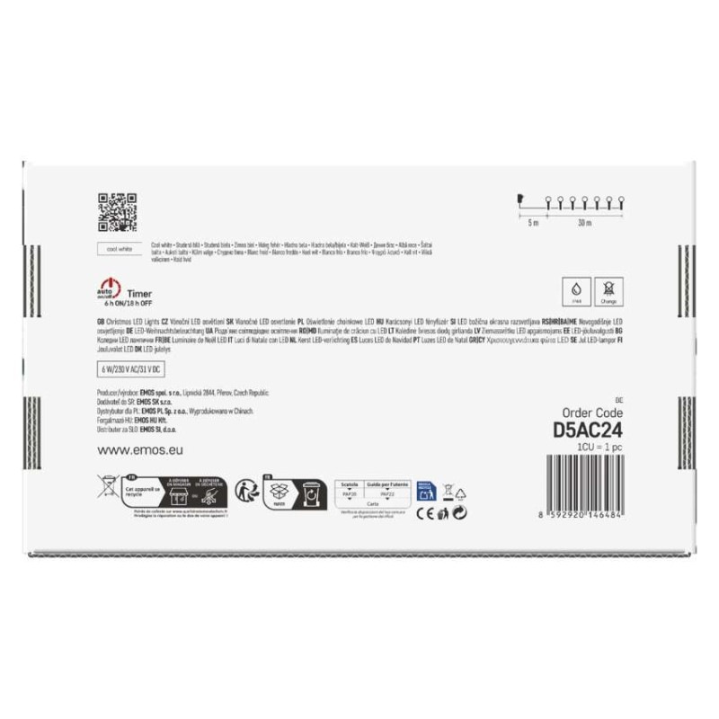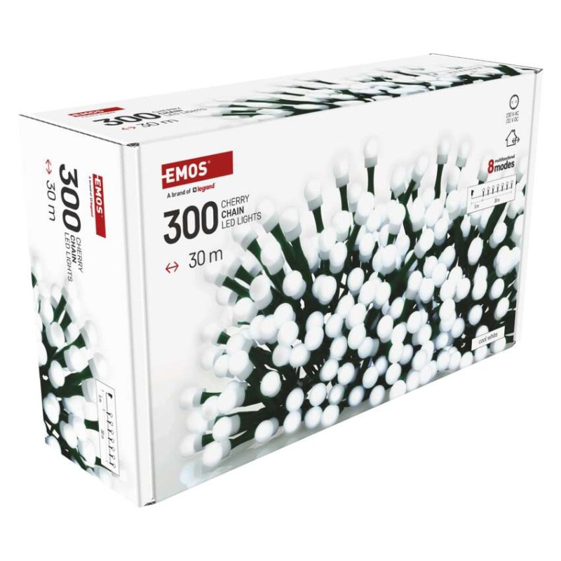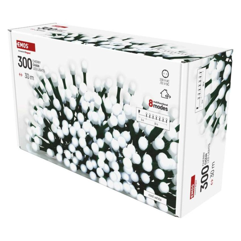 LED vianočná cherry reťaz–guličky, 30 m,vonkajšia aj vnútorná,studená biela, programy, čas