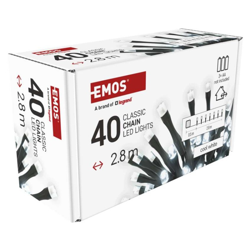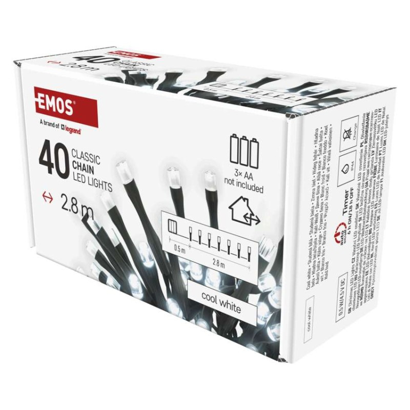 LED vianočná reťaz, 2,8 m, 3x AA, vonkajšia aj vnútorná, studená biela, časovač