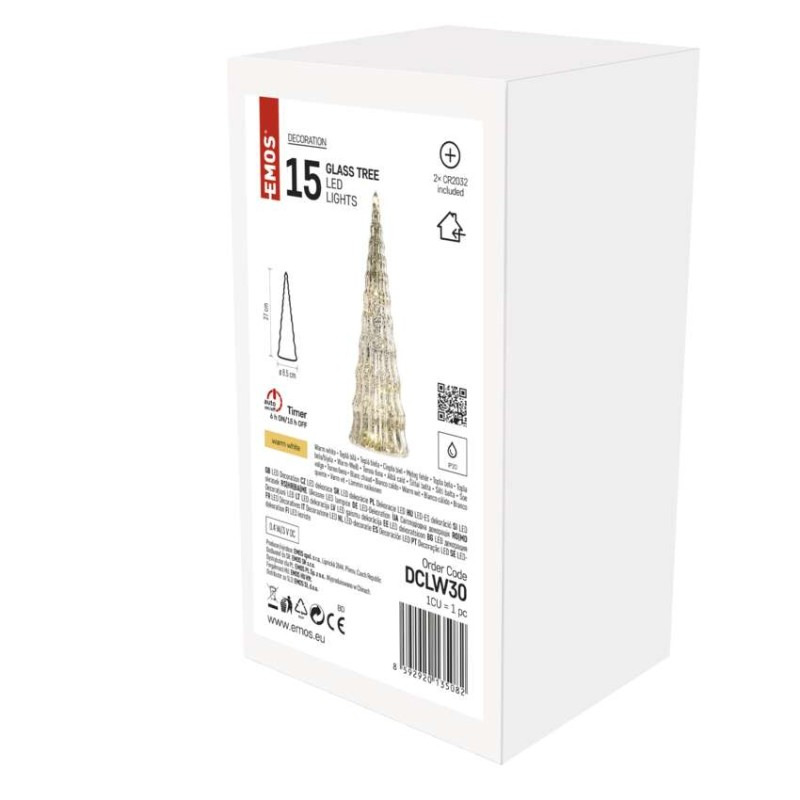 LED vianočný sklenený stromček, 27 cm, 2x CR2032, vnútorný, teplá biela, časovač