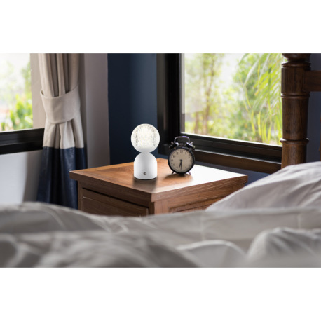 Nabíjateľná stolová lampa, kov biely, akryl číry, krištáľový efekt, stmievateľné, regulácia dotykové
