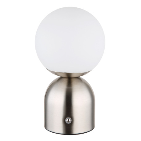 Nabíjateľná stolová lampa, kov matný nikel, plast biely, kábel PVC biely, dotykové zapnutie/vypnutie