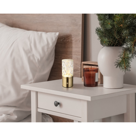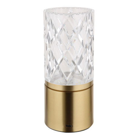 Nabíjateľná stolová lampa, kov mosadz, akryl číry, kábel PVC čierny, dotykové zapnutie/vypnutie, stm