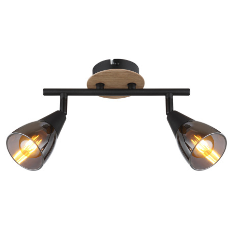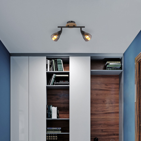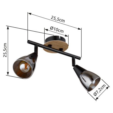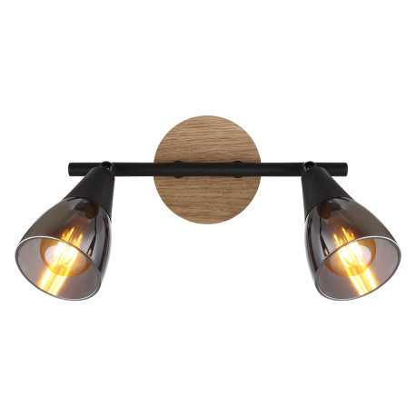 Nástenné svietidlo, bodové, kov čierny matný, drevo hnedé, sklo dymové, DxŠxV: 255x100x195mm, bez ži