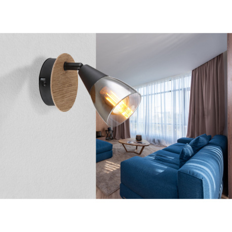 Nástenné svietidlo, bodové, kov čierny matný, drevo hnedé, sklo dymové, ø 80 mm, V:130mm, H: 160mm,