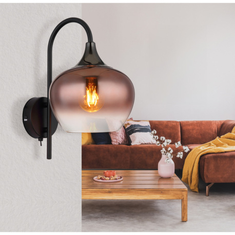 Nástenné svietidlo, kov čierny, kov čierny chróm, sklo medenej farby, priehľadné, kolískový vypínač