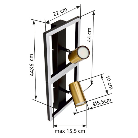 Nástenné svietidlo kov čierny matný, kov mosadz matná, plast biely, DxŠxV: 440x220x155mm, vrátane LE