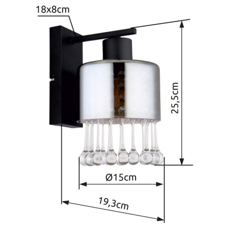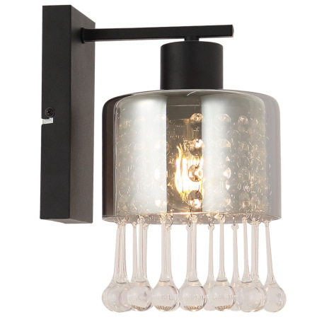 Nástenné svietidlo, kov čierny matný, sklo dymové, sklenené kvapky priehľadné, akrylové krištále pri