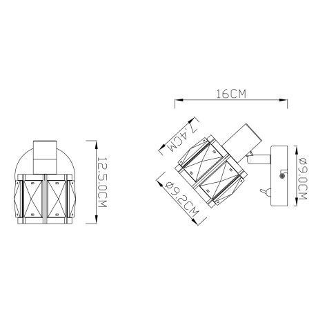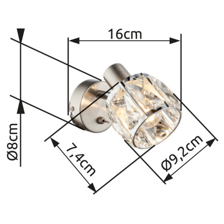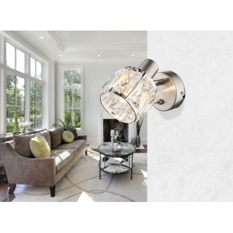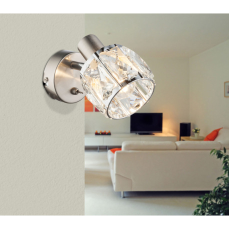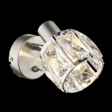 Nástenné svietidlo, kov nikel matný, chróm, sklenený kryštál priehľadný, vypínač, ŠxV:92x125, H:160,