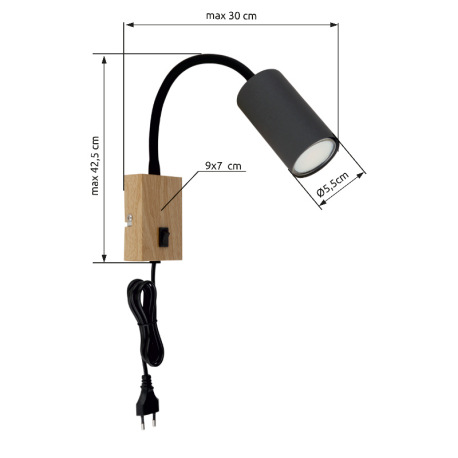 Nástenné svietidlo, kov nikel, plast čierny, PVC kábel transparentný, s vypínačom, Flexo, ŠxV:70x440