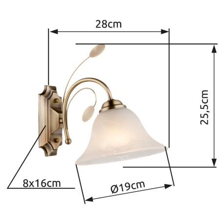 Nástenné svietidlo, mosadz, sklo biele alabaster, ŠxV: 190x255, H: 280, bez žiarovky 1xE27, max. 60W
