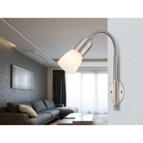 Nástenné svietidlo, nikel matný, biele sklo, vrátane transparentného kábel 1,5m, flexi, vypínač, 290