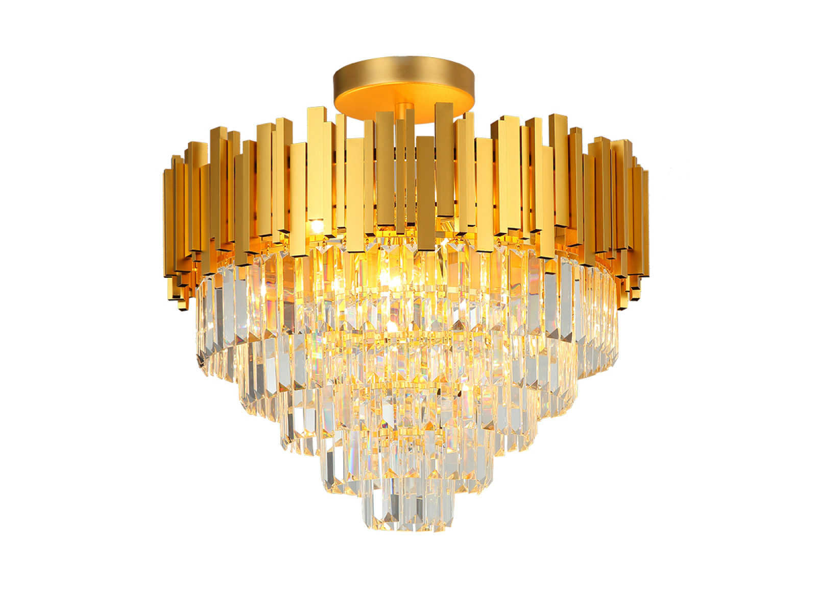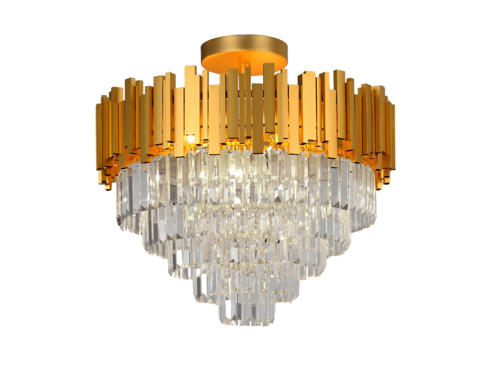 Toto výnimočné svietidlo spája moderný štýl s precíznym remeselným spracovaním. Telo svietidla je vyrobené z kvalitného kovu v elegantnom odtieni zlatej farby, pričom jeho povrch je bohato zdobený jemne brúsenými kryštálmi, ktoré nádherne lámu svetlo a vytvárajú jedinečný svetelný efekt.