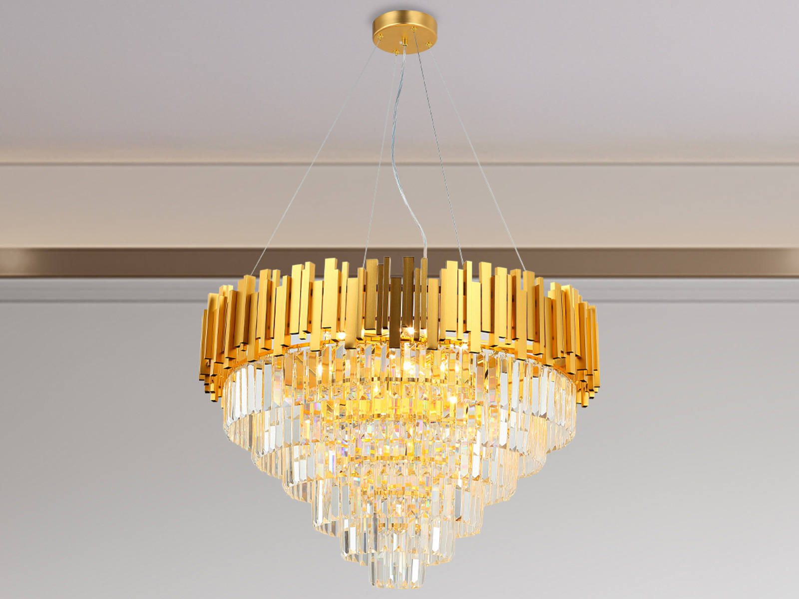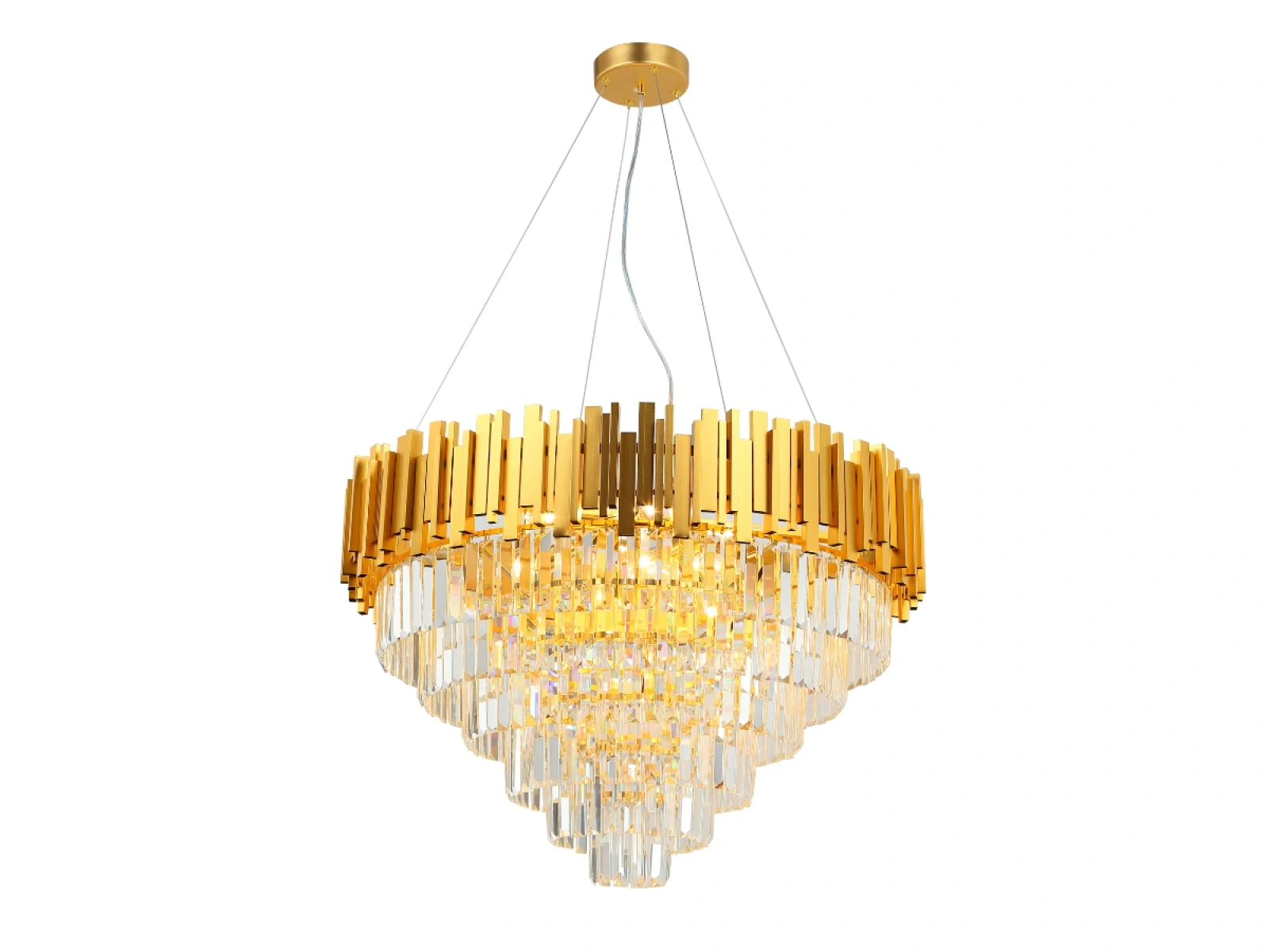 Toto výnimočné svietidlo spája moderný štýl s precíznym remeselným spracovaním. Telo svietidla je vyrobené z kvalitného kovu v elegantnom odtieni zlatej farby, pričom jeho povrch je bohato zdobený jemne brúsenými kryštálmi, ktoré nádherne lámu svetlo a vytvárajú jedinečný svetelný efekt.