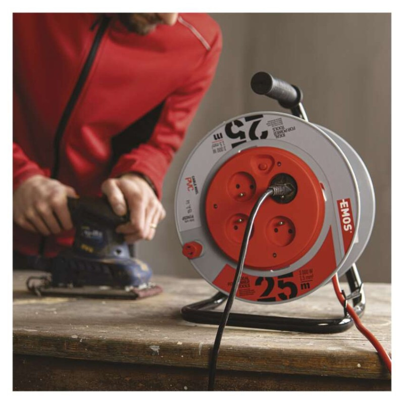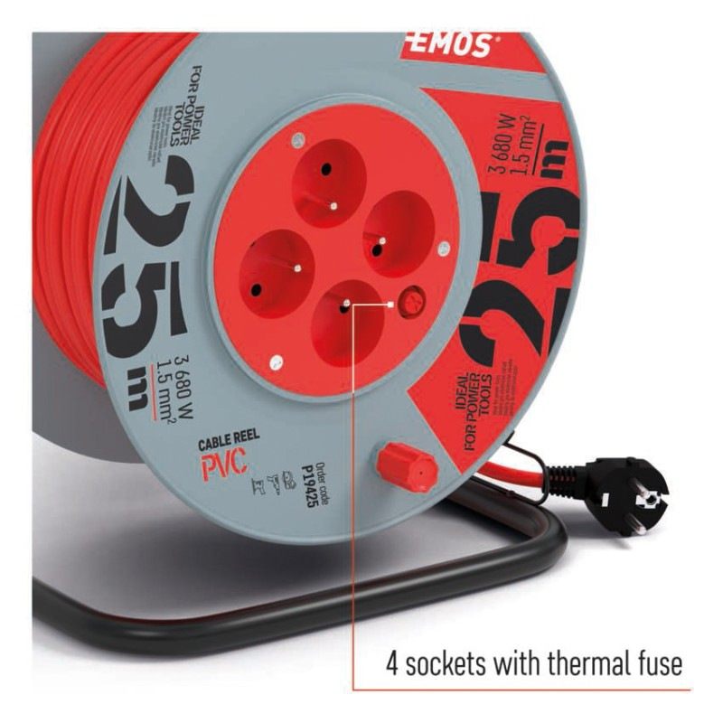 Predlžovací kábel na bubne 25 m / 4 zásuvky / červený / PVC / 230 V / 1,5 mm2