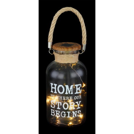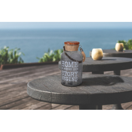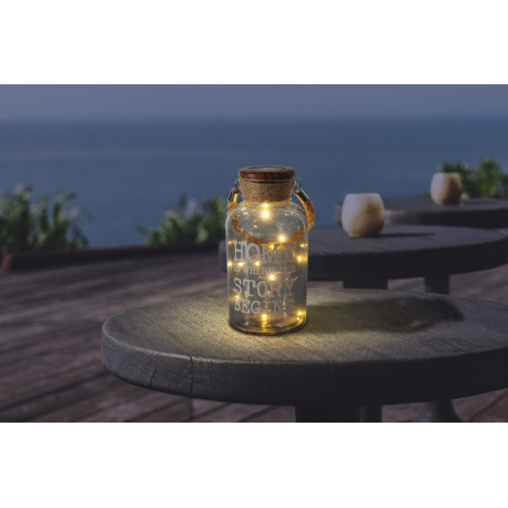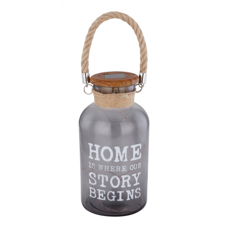 Solárne svietidlo, plast so vzhľadom dreva, priehľadné sklo, konopné lano hnedé, na zavesenie alebo