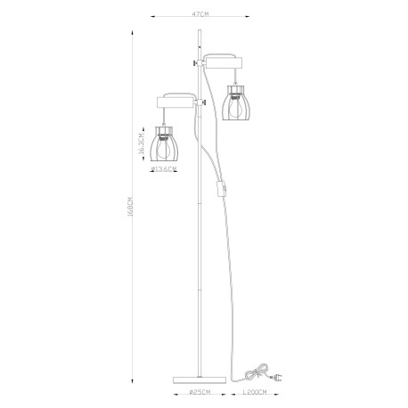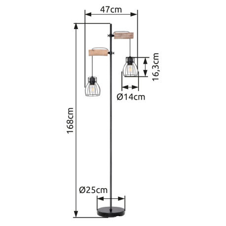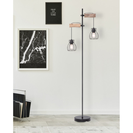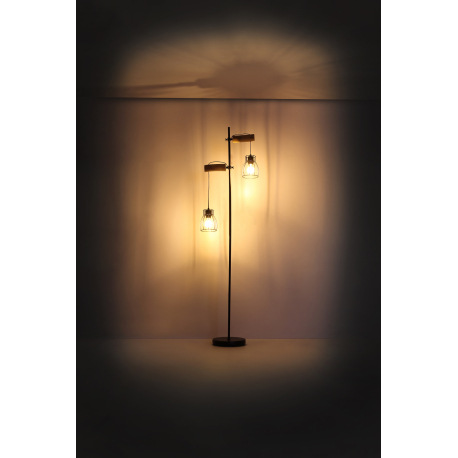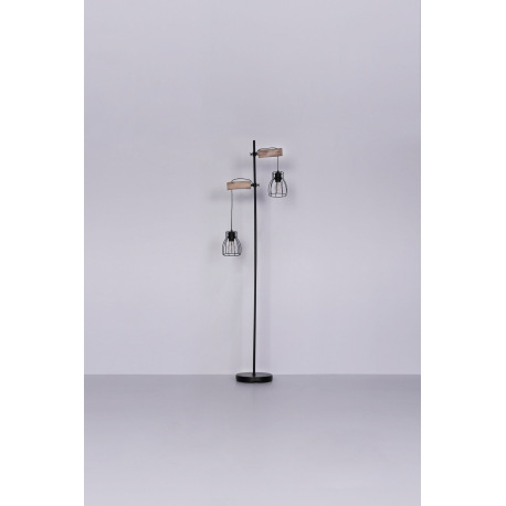 Stojanové svietidlo, čierny kov, drevo, vypínač, DxŠxV: 470x250x1680, bez žiaroviek 2xE27, max. 40W