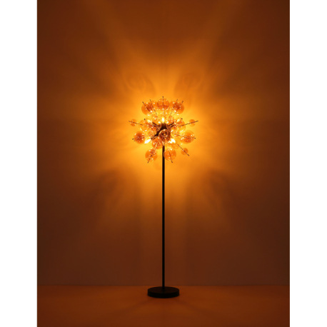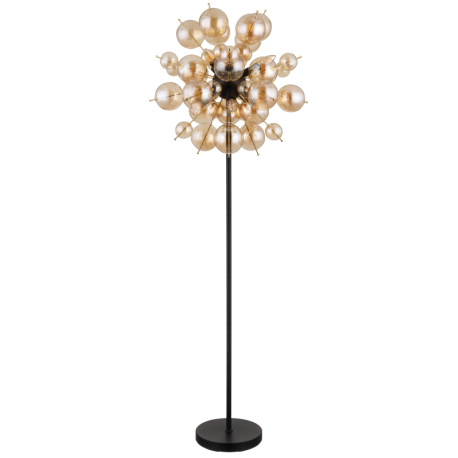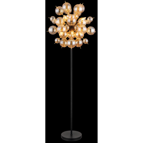 Stojanové svietidlo, kov čierny, kov zlatej farby, sklenené gule jantárové, kábel PVC čierny, vyínač