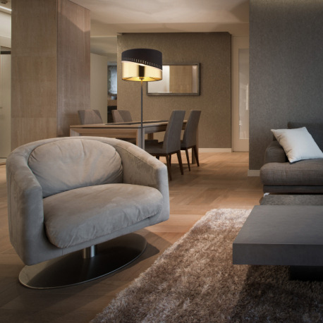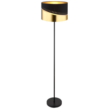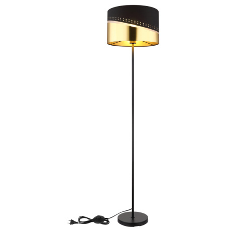 Stojanové svietidlo, kov čierny, textil čierny, plast zlatej farby, kábel PVC čierny, vyínač na kábl