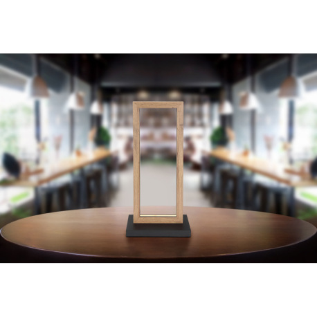 Stolná lampa kov čierna matná, MDF imitácia dreva, plast biely, kábel PVC čierny, vypínač na kábli,