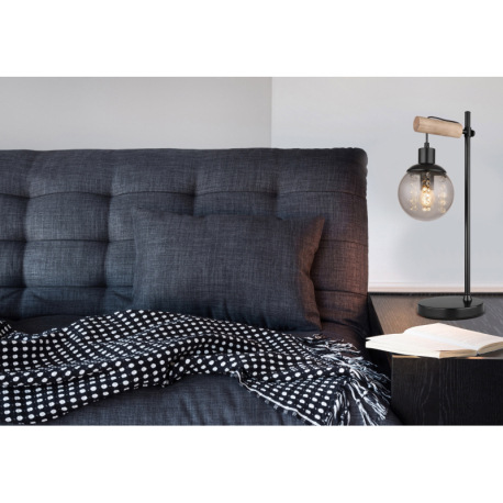 Stolová lampa, kov čierny matný, drevo prírodnej farby, sklo dymové, plastové krištále priehľadné, k