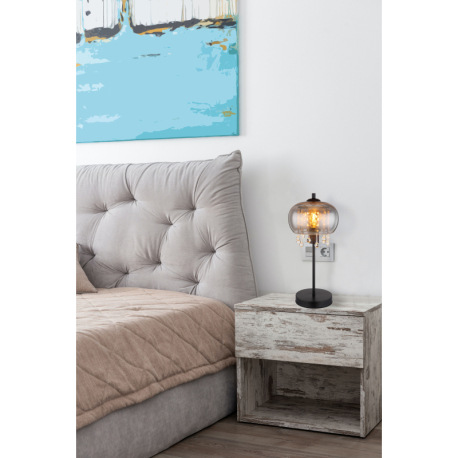 Stolová lampa, kov čierny matný, sklo dymové, sklenené krištále priehľadné, kábel textil čierny, kol