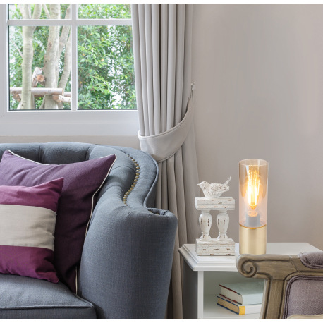 Stolová lampa, kov zlatý matný, sklo jantár, hnedý textilný kábel 1,5 m, dotykový vypínač on/off, Ø9