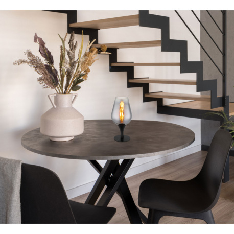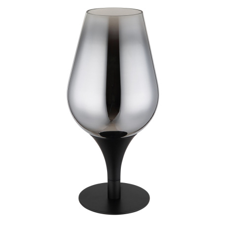 Stolové svietidlo, čierny matný kov, sklo chrómovej farby, priehľadné, čierny textilný kábel, kolísk
