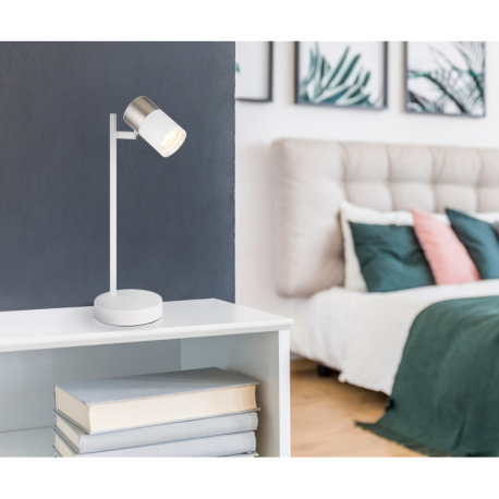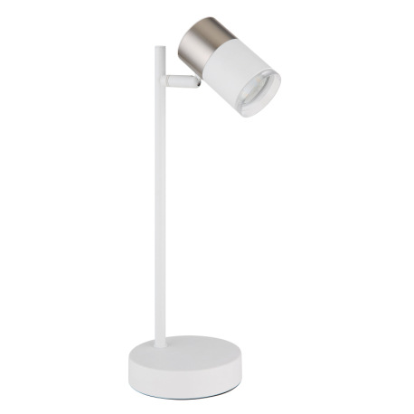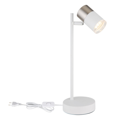 Stolové svietidlo, kov biely, hliník nikel, hliník biely, plast priehľadný, kábel PVC biely, kolísko