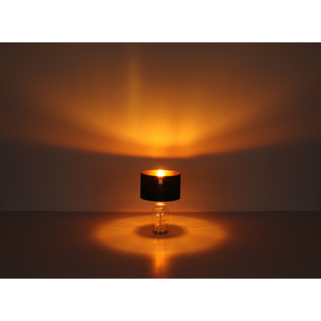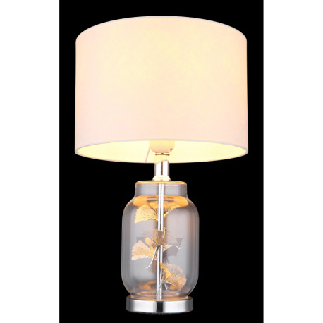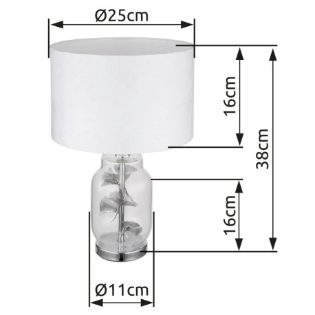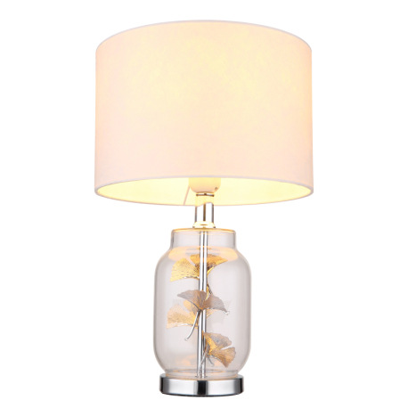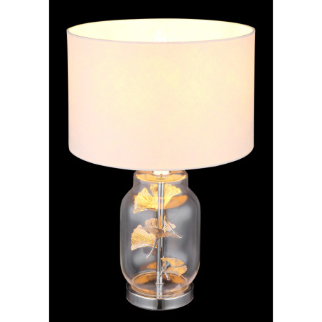 Stolové svietidlo, kov chróm, sklo priehľadné, biely textil, biely plast, priehľadný PVC kábel, kolí