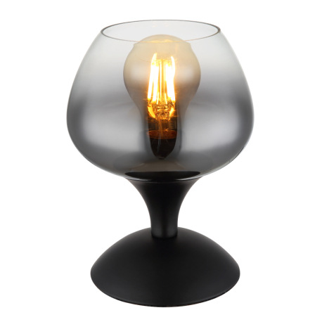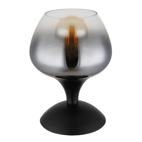 Stolové svietidlo, kov čierny matný, sklo dymové, číre, kábel čierny textil, kolískový vypínač na ká