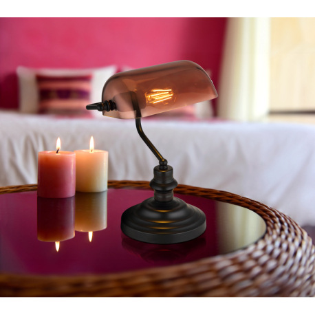 Stolové svietidlo, kov čierny, sklo medenej farby, priehľadné, kábel PVC čierny, kolískový vypínač n