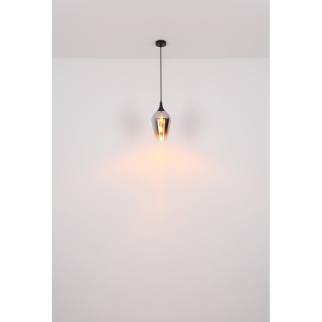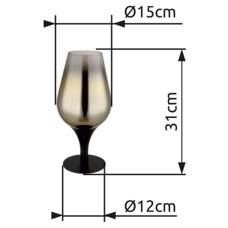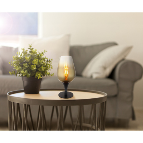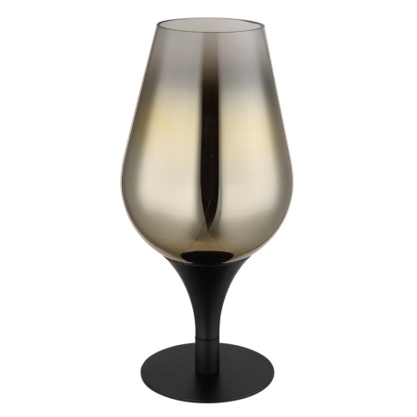 Stolové svietidlo, kov čierny, sklo zlatej farby, priehľadné, textilný kábel čierny, kolískový vypín