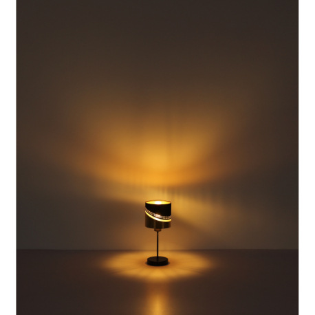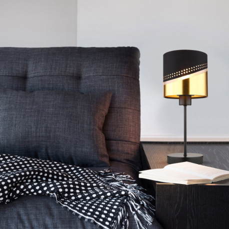 Stolové svietidlo, kov čierny, textil čierny, plast zlatej farby, kábel PVC čierny, kolískový vypína