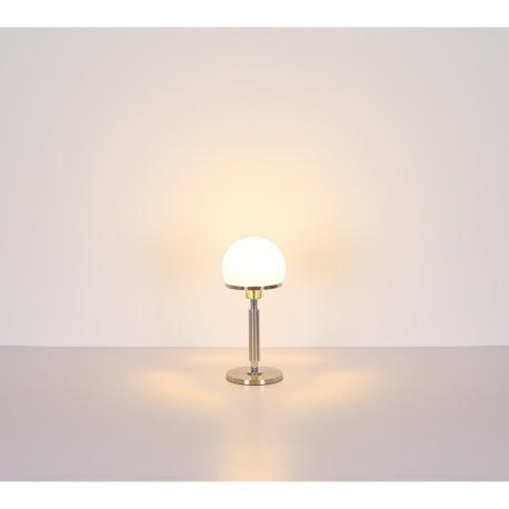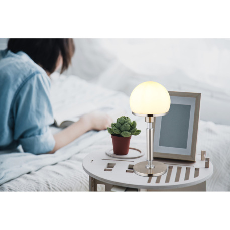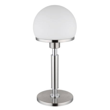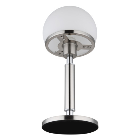 Stolové svietidlo, kov nikel matný, kov chrómovaný, sklo biele, textilný kábel čierny, kolískový vyp