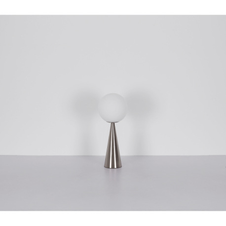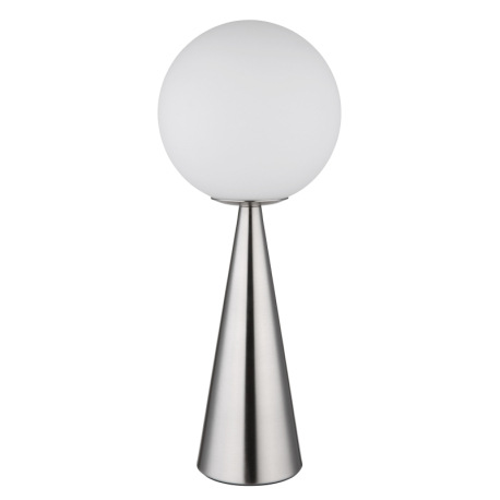 Stolové svietidlo, kov nikel, sklenená guľa biela, kábel textilný čierny, kolískový vypínač na kábli