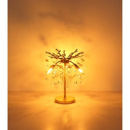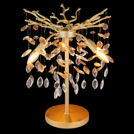 Stolové svietidlo, kov zlatej matnej farby, sklenené krištále jantárové, číre, kábel PVC, kolískový