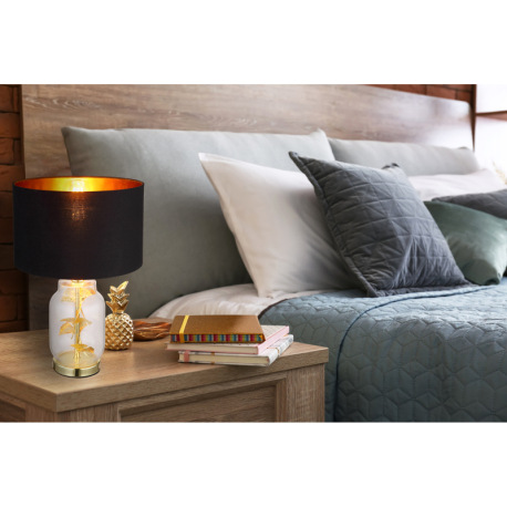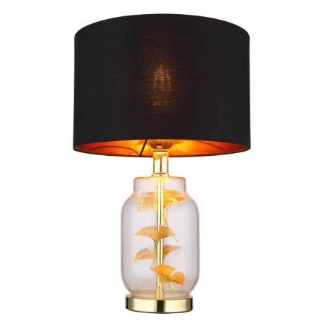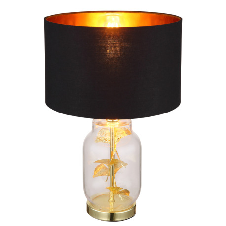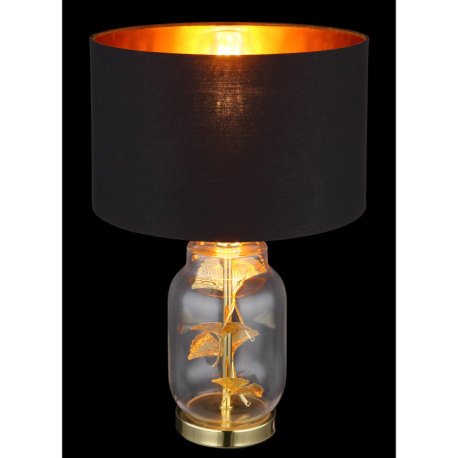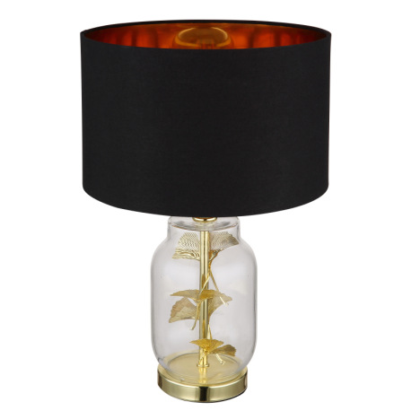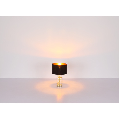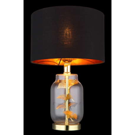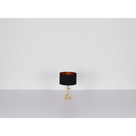 Stolové svietidlo, mosadzný kov, sklo priehľadné, čierny textil, plast zlatej farby, čierny PVC kábe