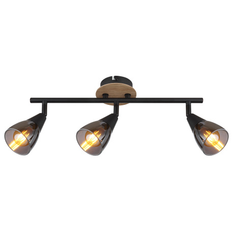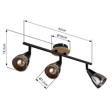 Stropné svietidlo, bodové, kov čierny matný, drevo hnedé, sklo dymové, DxŠxV: 420x100x195mm, bez žia