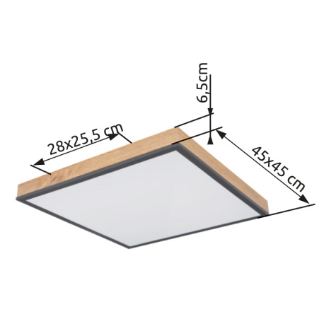 Stropné svietidlo, hliník, grafit, imitácia dreva, akryl biely, rám vo vzhľade dubu, DxŠxV: 450x450x
