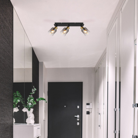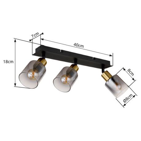 Stropné svietidlo, kov čierny matný, kov zlatý matný, sklo dymové, priehľadné, DxŠxV: 400x80x182mm,