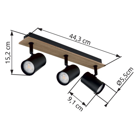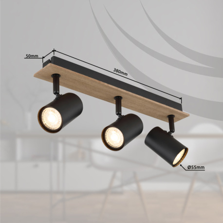 Stropné svietidlo, kov čierny matný, MDF imitácia dreva, DxŠxV: 410x60x152mm, bez žiaroviek 3xGU10,