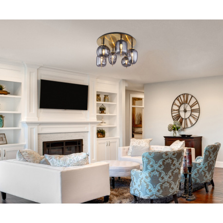 Stropné svietidlo, kov čierny, mosadz, dymové sklo, ø: 650mm, V:380mm, bez žiaroviek 6x E14, max. 40