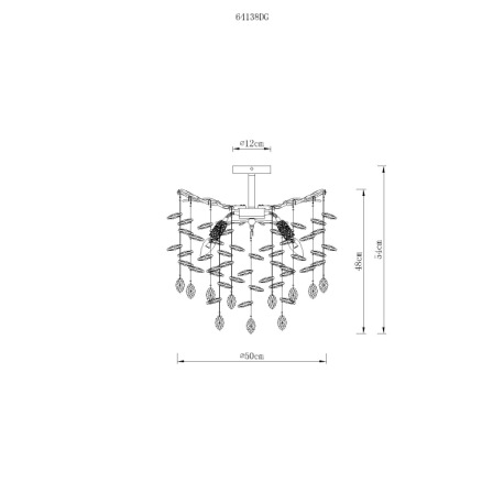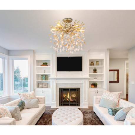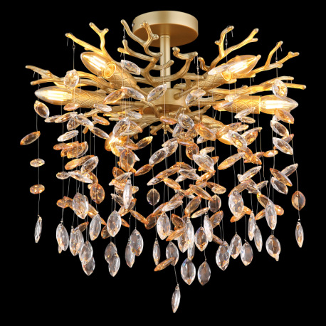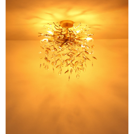 Stropné svietidlo, kov zlatej matnej farby, sklenené krištále jantárové, číre, flexo na objímkach, ø