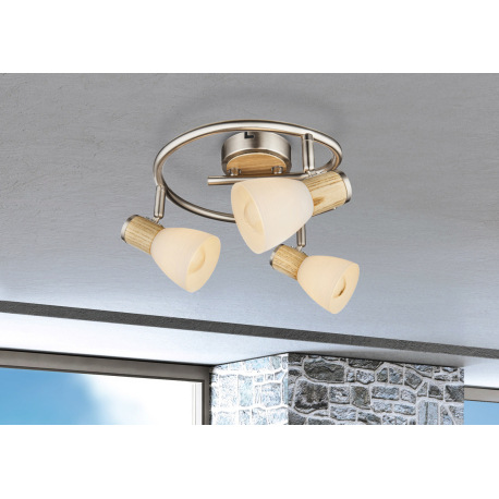 Stropné svietidlo, nikel matný, drevo, sklo biele pruhované, Ø 250, V:155, bez žiaroviek 3xE14, max.