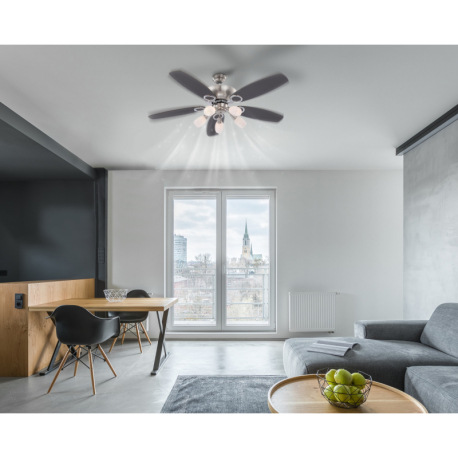Stropný ventilátor, chróm, nikel matný, biele sklo, MDF buk, MDF grafit, 3 rýchlosti, 2 smery otáčan